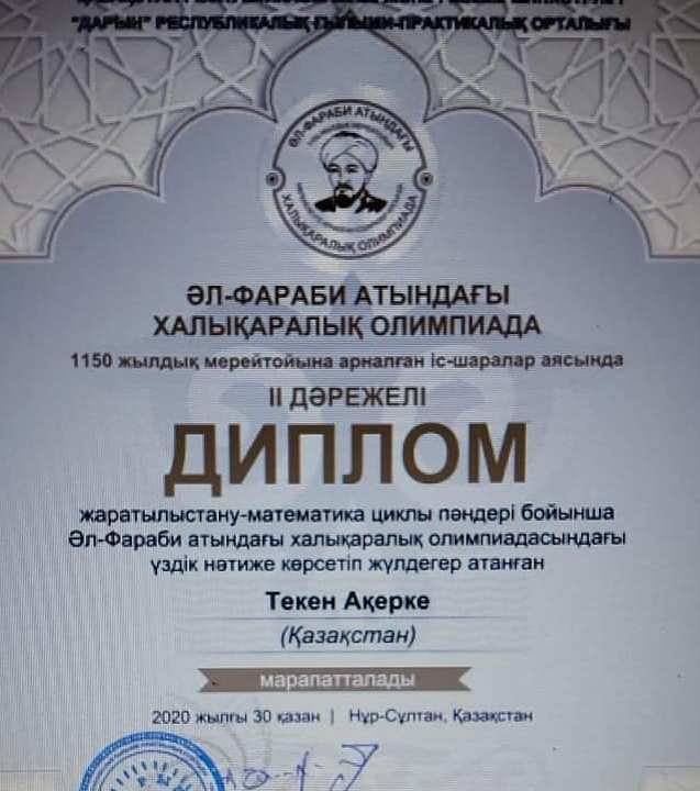 ІІ дәрежелі Диплом жаратылыстану математика циклы пәндері бойынша Әл-Фараби атындағы халықаралық олимпиадасындағы үздік нәтиже көрсетіп жүлдегер атанған 10 сынып оқушысы Текен Ақерке марапатталады. Құттықтаймыз!