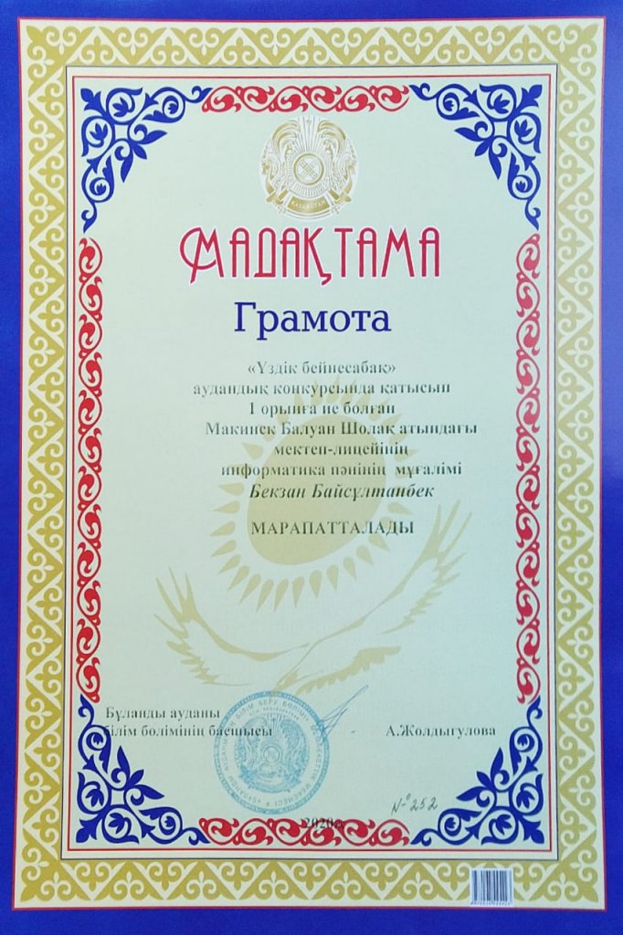 Карантин уақыты кезінде мектептің оқу жүйесі онлайн режимге көшуіне байланысты Ауданымыз "Үздік бейнесабақ" конкурсын ұйымдастырған болатын. Сол конкурсқа қатысып, өз бейне сабақтарын жолдаған ұстаздарымыз тарих пәні мұғалімі Теңсел Назгүл 2 орын алса, информатика пәні мұғалімі Бегзан Байсултанбек 1 орынға ие болды. Құттықтаймыз!
